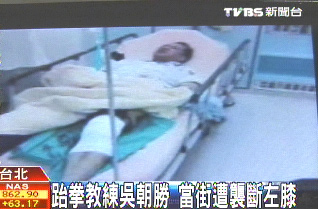 國際級(jí)八段跆拳道教練吳朝勝,目前正躺在病床上,身上衣服有斑斑血跡,左膝蓋包著紗布繃帶,粉碎性骨折,一直到凌晨都還在開刀。