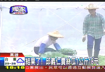 中新網(wǎng)7月20日電 據(jù)臺(tái)灣TVBS報(bào)道,臺(tái)當(dāng)局前“國安會(huì)秘書長”邱義仁5月初南下高雄務(wù)農(nóng),經(jīng)過2個(gè)多月,他種的絲瓜現(xiàn)在已經(jīng)結(jié)實(shí)累累,3天前邱義仁開始采收,10多箱的絲瓜經(jīng)由產(chǎn)銷班賣到臺(tái)北,1公斤的價(jià)格大概新臺(tái)幣18元,邱義仁的好友戴振耀說,受到臺(tái)風(fēng)影響,價(jià)格不算好,不過總算是邱義仁當(dāng)農(nóng)夫交出的第一張成績單。
