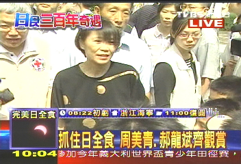 中新網(wǎng)7月22日電 據(jù)臺(tái)灣TVBS報(bào)道,本世紀(jì)最長(zhǎng)的日全食22日上午登場(chǎng),雖然臺(tái)灣地區(qū)只能看到約83%比例的日偏食,但已經(jīng)讓民眾趨之若騖。在天文館有現(xiàn)場(chǎng)觀測(cè)站,馬英九夫人周美青、臺(tái)北市長(zhǎng)郝龍斌也到現(xiàn)場(chǎng)一起觀賞。