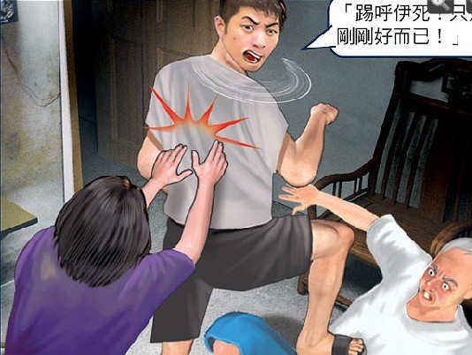沈父倒在地上不斷哀號(hào),在房?jī)?nèi)睡覺的沈弘隆姑姑趕緊跑出來察看,大喊:“不要打了!”一把將侄子推開說:“當(dāng)兒子的,怎么可以打老爸!钡蚝肼∈ダ硇,還回嗆姑姑說:“踢呼伊死(指沈父)!只是剛剛好而已!”甚至拉開姑姑,再踢了父親一腳,才掉頭逃離現(xiàn)場(chǎng)。