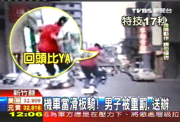 中新網(wǎng)7月23日電 據(jù)臺灣TVBS報道,新竹一名男子在車流量很高的市區(qū),騎車耍特技,把摩托車當滑板,雙腳站在坐墊上,時速50公里前進,雖然才17秒鐘,但看起來險象環(huán)生。