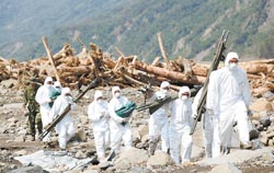 中新網(wǎng)8月20日電 臺軍部隊以及相關(guān)搜救人員連日來持續(xù)在高雄縣小林村等重災(zāi)區(qū)陸續(xù)搜索罹難者遺體,當(dāng)?shù)匕l(fā)現(xiàn)30幾處地面滲出血水,19日,搜救人員發(fā)現(xiàn)部分尸塊,推測是媽媽抱著小兒子逃命,卻不幸被傾流而下的巨大土石流掩滅。消息傳出,村人不勝唏噓。