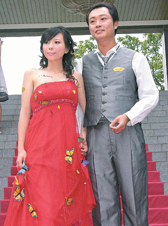 中新網8月27日電 10月舉行婚禮的準新娘陳韻如,26日試穿一款“蝴蝶禮服”,紅色低胸禮服上,“停”著30多只活體蝴蝶,遠望仿佛蝴蝶彩繪圖。不過,十分鐘后,緞面禮服上動也不動的蝴蝶突然展翅飛舞,驚艷全場。