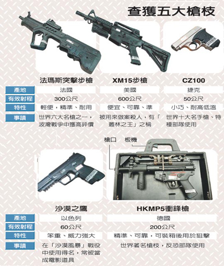 不乏島內(nèi)首見的槍型中,例如手提箱式MP5沖鋒槍,可從手提握把直接扣扳機(jī),外觀與一般手提箱無(wú)異,使用者提著它走進(jìn)人群,就算是“總統(tǒng)級(jí)”的維安也防不勝防,故有人稱它“要命的手提箱”,黑市價(jià)格應(yīng)在百萬(wàn)元以上,警方認(rèn)為訂貨者動(dòng)機(jī)可疑,準(zhǔn)備用它來(lái)刺殺誰(shuí),有查明必要;另有9把以色列突擊步槍,浸泡海水后可立即使用,也是首次查獲。