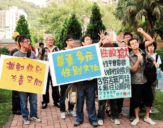 據(jù)臺(tái)灣《聯(lián)合報(bào)》報(bào)道,“打破宿舍門禁、落實(shí)性別平權(quán)”、“解放師大性教育,追求友善好校園”,學(xué)生高舉海報(bào)、大聲呼喊口號(hào),師大化學(xué)系石姓學(xué)生是在網(wǎng)絡(luò)上號(hào)召學(xué)生,他們從校門口游行到男三宿舍,但過(guò)程中插曲不斷,正反意見兩極。