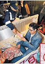中新網(wǎng)11月16日電 據(jù)臺(tái)灣《蘋果日?qǐng)?bào)》報(bào)道,日前吃牛糞抗議美國(guó)牛肉進(jìn)口的臺(tái)大社會(huì)學(xué)研究所博士班學(xué)生朱政騏,前晚開始在“立法院”大門口前躺棺絕食抗議美牛進(jìn)口,被警方以違反“未依規(guī)定在道路堆放雜物,妨礙通行”為由開罰。