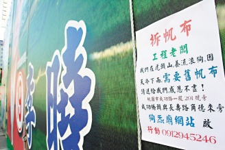 桃園市區(qū)大型選舉廣告牌下端,連日被貼了索取告示:“拆帆布老板,我們?cè)诨㈩^山飼養(yǎng)流浪犬,因?yàn)樘鞖夂洌绻f帆布不再需要,請(qǐng)送給我們,感恩不盡……”