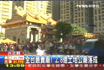 中新網(wǎng)1月19日電 據(jù)臺灣TVBS報(bào)道,臺北縣的深丘福德宮,因?yàn)樯w在黃金地段的新板特區(qū),以2年前一平米200萬(新臺幣 下同)的地價計(jì)算,這間土地公廟地價已經(jīng)高達(dá)2.8億,號稱是全臺最貴的廟。之前因?yàn)椴少彿ㄟt遲無法完工,最近終于蓋好了,上午舉行安座大典,神明搬新家,場面相當(dāng)熱鬧。