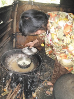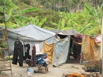 簡(jiǎn)陋破落帳篷搭在香蕉園里,卓姓夫妻與兒子擠在不到兩坪的空間里;室內(nèi)堆放著臟亂衣物等用品,睡覺(jué)的地方用木板稍隔開(kāi),陳設(shè)比起工寮還要簡(jiǎn)陋。緊鄰廚房?jī)H有一只燒柴鍋?zhàn),卓家女主人鍋(zhàn)诱谡舻,蒸蛋的水暗沉,她說(shuō):“這是早餐!