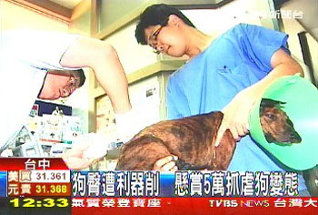 中新網(wǎng)4月30日電 據(jù)臺(tái)灣TVBS報(bào)道,臺(tái)灣又現(xiàn)虐待動(dòng)物變態(tài),一只虎斑狗的后腿上方,被人用斧頭之類的利器削掉,傷口面積非常大,內(nèi)臟外露嚴(yán)重感染,幸好被一名好心愛狗人士發(fā)現(xiàn),送狗去治療,但狗狗仍有生命危險(xiǎn),動(dòng)物救援小組志工痛斥虐狗,并懸賞5萬元(新臺(tái)幣,下同)請(qǐng)民眾幫忙提供線索,揪出虐狗變態(tài)。