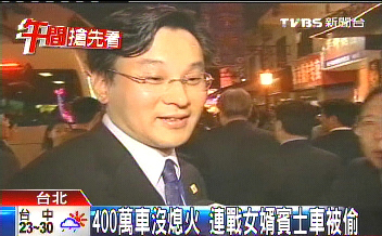 現(xiàn)在失竊率高,連戰(zhàn)的女婿陳弘元也遭殃,上周五,陳弘元和妹妹,到新竹竹東鎮(zhèn)拜訪易經(jīng)老師,趁著空檔,司機開黑色奔馳車到超商繳停車費,一時疏忽,車子沒有熄火,短短幾分鐘,車子被兩名歹徒開走。