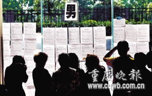 114號男士的資料顯示:28歲,身高1.78米,重大建筑系碩士畢業(yè),目前在江北區(qū)一事業(yè)單位做設(shè)計工作。母親張女士身旁坐了8位父母,排隊和她交談。“我女兒在重慶師范大學(xué)讀研究生,單位委培,長得也秀氣!薄拔遗畠阂膊诲e,西南財大畢業(yè),在建行上班”……幾位媽媽相互比拼,張女士連忙拿出筆記本一一記下他們的電話,說:“條件都好,我們當(dāng)父母的只是搭橋,讓兒女們自己選吧!