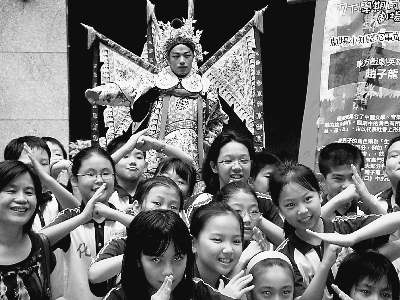 工作人員在旁講解:馬歇·馬叟是法國(guó)默劇大師;莎士比亞是英國(guó)文藝復(fù)興時(shí)期杰出的戲劇家和詩(shī)人;趙子龍是三國(guó)人物,這是趙子龍?jiān)诰﹦≈械陌缦,趙子龍是武生,扮相俊逸,身段威武穩(wěn)健……三個(gè)人物配合講解,擺出各種動(dòng)作,小朋友們聽(tīng)得津津有味!芭!”“趙子龍”身邊的標(biāo)示牌不知何故忽然倒下。一個(gè)小朋友立刻解釋:“趙子龍不愧是武生,用氣功就可以把牌子推倒!”此言一出,“趙子龍”都忍不住了,跟大家一起哈哈大笑。