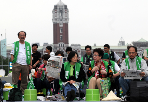 凌晨靜坐民眾逐漸散去,至上午仍在凱道群眾大約剩上千人,主舞臺(tái)區(qū)有民進(jìn)黨主席蔡英文、呂秀蓮、前“行政院長”謝長廷、蘇貞昌等人。