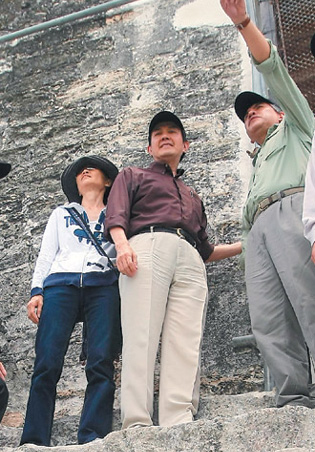 原來,馬英九陪同周美青爬上馬雅四號神殿,馬英九贊嘆建筑之美,甚至向媒體解釋“神殿石塊如何黏著”時(shí),一旁的“酷酷嫂”突然竄出,拍著馬英九肩膀笑稱“三秒膠?”讓馬英九頓時(shí)語塞,不知如何接話。