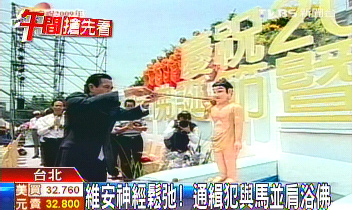 當(dāng)時(shí)情景是:觀禮臺(tái)上,馬英九就坐在佛祖香案左手邊第一個(gè)位置,通緝犯林松輝“以中華理教總會(huì)”理事長名義大剌剌坐在香案另一頭,和馬英九相隔僅僅10米。