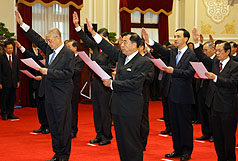 馬英九下午主持了“行政院院長”、“副院長”、“政務(wù)首長”暨“總統(tǒng)府”秘書長宣誓就職典禮,吳敦義與新任“總統(tǒng)府”秘書長廖了以站在最前排。蕭萬長、“立法院長”王金平、“司法院長”賴英照、“監(jiān)察院長”王建煊、“考試院長”關(guān)中及“國安會”秘書長蘇起觀禮。