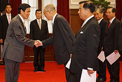 馬英九隨后并一一和吳敦義、廖了以、朱立倫與“政務(wù)首長”握手,與會人士在儀式結(jié)束后,相互寒暄。