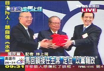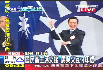 中新網(wǎng)10月17日電 馬英九17日上午接任中國國民黨主席,與吳伯雄進(jìn)行交接儀式,接下黨主席印信,傳承黨旗。
