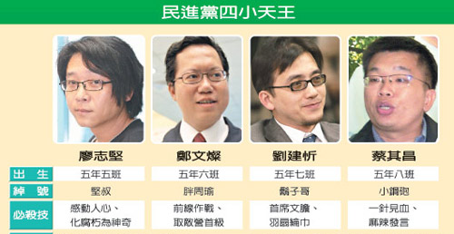 據(jù)臺(tái)灣聯(lián)合報(bào)報(bào)道,為了對(duì)決國(guó)民黨主席馬英九、副主席詹春柏、秘書(shū)長(zhǎng)金溥聰?shù)摹敖鹑恰保逃⑽亩ㄕ{(diào),民進(jìn)黨是世代接班的大軍團(tuán)作戰(zhàn),老經(jīng)驗(yàn)的“四大天王”(呂秀蓮、謝長(zhǎng)廷、蘇貞昌、游錫堃)和黨秘書(shū)長(zhǎng)蘇嘉全帶領(lǐng)年輕世代,“老干新枝”作戰(zhàn)模式,將延續(xù)到明年“五都”和2012年“大選”布局。