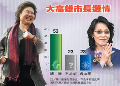 報(bào)道說(shuō),調(diào)查發(fā)現(xiàn),陳菊親民形象較黃昭順略勝一籌。55%選民對(duì)于陳菊有好印象,19%不喜歡她;相對(duì)來(lái)說(shuō),喜歡和不喜歡黃昭順的選民各占32%與19%,48%沒(méi)有深刻印象。從現(xiàn)階段支持率來(lái)看,陳菊目前獲得53%選民支持,黃昭順支持率23%,僅23%未決定。進(jìn)一步分析顯示,陳菊不僅在泛綠及中立選民獲得壓倒性支持,即便是泛藍(lán)支持者,也有25%屬意陳菊擔(dān)任大高雄市長(zhǎng)。
