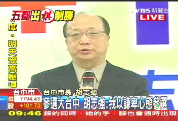 中新網(wǎng)5月13日 據(jù)臺灣TVBS電視臺報道,國民黨中常會昨天通過“五都”市長提名征召人選,藍營年底選戰(zhàn)五虎將正式就戰(zhàn)斗位置。爭取大臺中市長的胡志強,今日上午召開記者會,正式對大臺中市民表態(tài)參選。他表示將以最謙卑的心情,來參選大臺中市長。