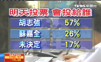 中新網(wǎng)5月26日電 據(jù)臺灣TVBS報道,藍綠陣營五都選將都已經(jīng)確定,TVBS于25日晚針對大臺中“直轄市長”參選人胡志強和蘇嘉全兩人進行民調(diào),“假如明天就是投票日,您比較會投給哪一位?”結(jié)果胡志強以57%勝蘇嘉全的26%。