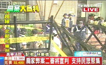 中新網(wǎng)6月11日電 據(jù)臺灣TVBS報道,陳水扁家族涉及的公務(wù)機要費、南港展覽館、龍?zhí)顿彽丶跋村X案等案,臺灣高等法院于11日上午二審宣判;高等法院場外聚集了一堆挺扁、反扁民眾等候判決結(jié)果,警方派出大批警力,進行周邊出入管制,嚴(yán)防沖突發(fā)生。