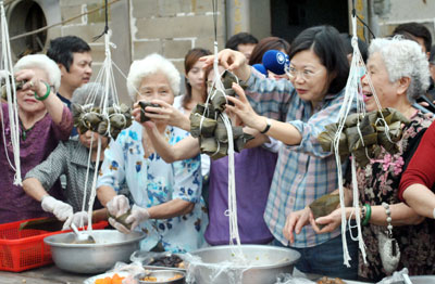 一邊品嘗著粽子,蔡英文表示,雖然第一次到貢寮龍門村,但開車常經(jīng)過,而小時候父親每年夏天都會招待員工到福隆海水浴場游泳,她對這里感覺很親切,并承諾若當(dāng)選新北市長,明年端午節(jié)還要來龍門包粽子。