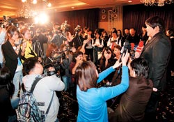 記者會(huì)上,SONY播小胖的歷程VCR,他也高唱成名曲〈I Will Always Love You〉,看到臺(tái)下成群結(jié)隊(duì)的粉絲,拿著“小胖”、“加油”的牌子,他突然哽咽:“謝謝你們,我一定會(huì)加油,不辜負(fù)大家的期望!彪S即拿起手帕拭淚,笑稱:“我鼻酸,感覺很激動(dòng),淚水混著汗水掉下來了!贝箨慡ONY歌手李易峰和蘇醒,分別吆喝自己粉絲,到場(chǎng)替師弟小胖加油打氣。