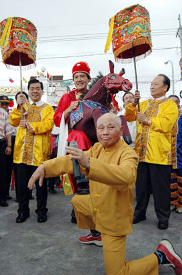 據“中央社”報道,在曾獲得“薪傳獎”的宜蘭布馬陣祖師爺林榮春帶領之下,馬英九穿上狀元戲服,戴上紅色官帽,騎著一匹道具馬,有摸有樣地扭了起來,令觀眾大飽眼福。