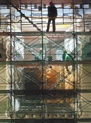 原紀(jì)念堂主建筑的牌匾,長(zhǎng)近四米,寬二點(diǎn)四米,由十五塊花崗巖板組成,中間五塊巖板陰刻“中正紀(jì)念堂”五字。昨天下午開(kāi)始拆卸,到了夜間仍施工,已經(jīng)拆除牌匾右邊的幾塊。預(yù)定今天繼續(xù)拆,拆完就可掛新牌匾,舊牌匾存放在紀(jì)念堂內(nèi)的文史館。