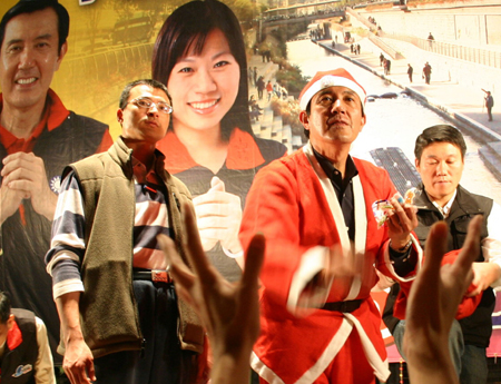 中新網(wǎng)12月24日電 隨著圣誕節(jié)的到來(lái),臺(tái)灣的政治人物也搭上這股節(jié)日熱。國(guó)民黨“立委”參選人23日晚在高雄縣鳳山市舉辦圣誕晚會(huì),馬英九裝扮成圣誕老人,發(fā)送糖果,分送幸福。