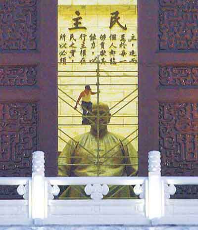 另?yè)?jù)“中廣新聞網(wǎng)”報(bào)道,臺(tái)當(dāng)局“教育部”敲定明年元旦開(kāi)放臺(tái)灣民主紀(jì)念館(原中正紀(jì)念堂)主館,“教育部主任秘書”莊國(guó)榮表示,全高9.8米的蔣介石銅像不拆,但周圍會(huì)設(shè)置10米高的鋼架。報(bào)道稱,重新開(kāi)放的臺(tái)灣民主紀(jì)念館2樓蔣介石銅像區(qū),將以“空間解嚴(yán)”的方式規(guī)劃,設(shè)置10米高的鋼架,鋼架上將會(huì)呈現(xiàn)“二二八事件”、白色恐怖受難者姓名、照片、事跡以及許多“人權(quán)運(yùn)動(dòng)者”的努力。往后民眾將無(wú)法完整觀看銅像,只得通過(guò)鋼架間的細(xì)縫,隱隱約約一窺原貌。莊國(guó)榮說(shuō),鋼架展設(shè)是由“二二八”和平基金會(huì)規(guī)劃,花費(fèi)約100萬(wàn)新臺(tái)幣,未來(lái)將成為常設(shè)展。