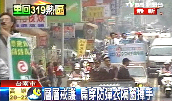 下午四點左右,陳水扁站在宣傳車上從臺南南定橋出發(fā)。與上次不同的是,宣傳車加高防護,蓋住了他的招牌鮪魚肚。車隊在臺南市大街小巷穿梭,接近五點便來到當(dāng)年槍響的金華路,并做短暫停留。