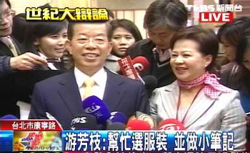 據(jù)“中央社”報道,民進黨候選人謝長廷穿上游芳枝挑的深藍色西裝、黃色領帶,看起來相當有精神。游芳枝也幫謝長廷貼心記了許多小筆記,寫在小卡片上。