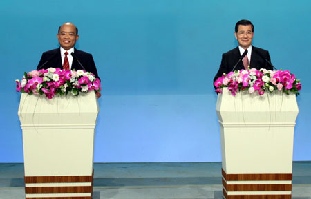 蕭萬長與蘇貞昌這回不約而同都打紅色領(lǐng)帶。蘇貞昌夫人詹秀齡陪伴出席,蕭萬長一個人形單影只前來應(yīng)戰(zhàn),兩人都希望能在唯一一場政見會中替選戰(zhàn)加分。