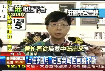 中新網(wǎng)3月17日電 臺(tái)當(dāng)局“教育部”主任秘書莊國榮辱罵馬英九父親馬鶴凌,昨晚已經(jīng)為此下臺(tái)。據(jù)臺(tái)灣TVBS報(bào)道,莊國榮2007年8月1日以“法學(xué)專家”出任臺(tái)“教育部”主秘,語出驚人的風(fēng)格為他在8個(gè)多月的任期中留下不少“驚世言論”。