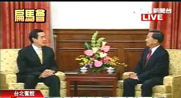 在陳水扁邀請下,馬英九今天上午10點(diǎn)半在臺北賓館會面,雙方展開3對3的會談。
