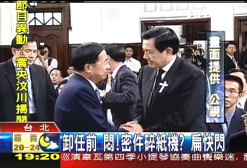 中新網(wǎng)5月15日電 5月20日臺灣當局將進行權(quán)力交接。即將卸任的陳水扁和就要接棒的馬英九,14日在柏楊追思會上相遇。陳水扁與馬英九碰頭后,兩人除了進出場兩度握手后,沒有其它互動。