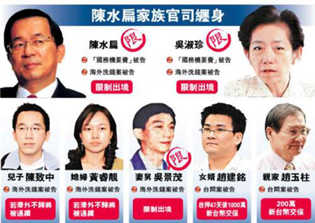 陳由豪對陳水扁“黑金疑云”開出關(guān)鍵第一槍之后,引發(fā)多米諾骨牌效應(yīng),接下來的四年,每次陳家曝光新的貪腐丑聞,臺灣老百姓都被嚇得目瞪口呆。陳水扁2004年連任后實行財產(chǎn)信托,申報財產(chǎn)從1994年任臺北市長前的1000萬元,飆漲到2003年底的7000萬元,股票市值從最初的55萬增至3億多元;2004年,媒體爆出吳淑珍收受SOGO百貨總值880萬元購物禮券,介入SOGO經(jīng)營權(quán)爭奪戰(zhàn);2006年5月,陳水扁的女婿趙建銘被指控涉嫌臺開股票內(nèi)線交易;2006年6月,吳淑珍卷入“國務(wù)機要費案”。