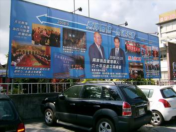 中新網(wǎng)8月28日電 據(jù)臺灣“中廣新聞”報道,國民黨臺東縣黨部27日在大門前懸掛黨主席吳伯雄與中共中央總書記胡錦濤握手的照片,以及訴求主題為“兩岸關(guān)系、雨過天青”的巨幅文宣廣告牌,相當引人注目。