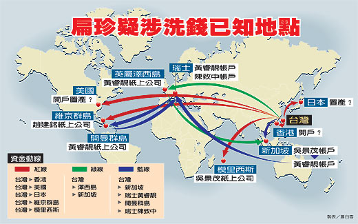 中新網(wǎng)8月30日電 據(jù)臺(tái)灣《聯(lián)合報(bào)》報(bào)道,臺(tái)灣“最高檢“特偵組追查陳水扁家庭海外密帳,發(fā)現(xiàn)陳水扁家的資金,曾在臺(tái)灣以外至少四大洲的十個(gè)國(guó)家或地區(qū)流轉(zhuǎn),包括被視為洗錢天堂的英屬開曼群島、澤西島等地,金額疑超過十億元(新臺(tái)幣,下同);檢方認(rèn)為陳水扁家在日本、美國(guó)也有資產(chǎn),正過濾、查證相關(guān)情資。