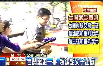 據(jù)臺灣TVBS報道,臺開案今天“高院”更一審開庭,上午8點40分時趙玉柱抵達法院,隨后8點55分趙建銘也抵達,對于陳幸妤昨天說自己身體也不好,趙建銘只是微笑沒有回答,之后快閃進了法院。