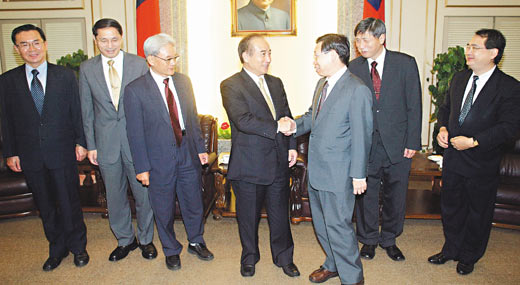 臺灣“司法院”新任“大法官”(左起)葉百修、陳春生、黃茂榮,陳新民(右一)、陳敏(右二),3日由“司法院秘書長”謝文定(右三)帶隊拜會臺“立法院長”王金平(右四)。(圖:臺灣《聯(lián)合報》)
