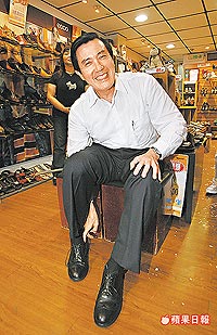 馬英九買皮鞋,鼓勵(lì)民眾多消費(fèi)。(圖:臺(tái)灣《蘋果日?qǐng)?bào)》)
