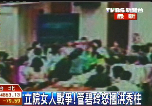 但國民黨“立委”洪秀柱上前制止時(shí),將綠營女“立委”手中的廣告牌撥向一旁管碧玲的助理,造成助理眼睛受傷,管碧玲不滿上前理論,情急下居然打了洪秀柱一巴掌,讓洪秀柱火冒三丈爆發(fā)拉扯。