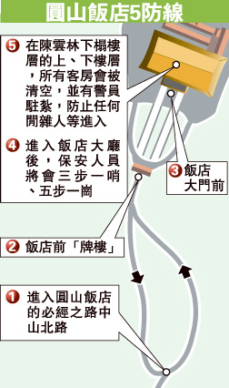 圓山飯店地形位居臺北的小山丘上,具保安優(yōu)勢。據(jù)悉,為阻絕綠營方抗議民眾可能靠近飯店,警方會在陳云林訪臺期間,在飯店內(nèi)外設(shè)置5道關(guān)卡,其中在門外設(shè)置三道防線(見示意圖),最外圍是進入圓山飯店唯一入口前的中山北路,這里距離飯店約500米,而飯店前的“牌樓”則是第二道關(guān)卡,距飯店大廳約200米。