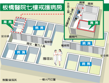 板橋醫(yī)院的戒護(hù)病房雖然沒有窗戶,但因是中央空調(diào),不至于有空氣無法流通問題。雖然戒護(hù)病房里都備有手銬腳鐐等戒具,但并未使用。