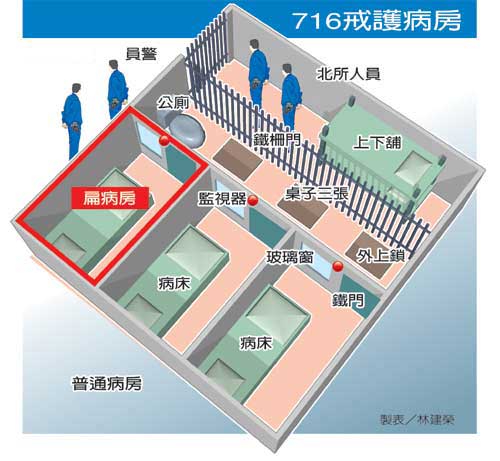 板橋醫(yī)院戒護病房是將七一六號病房另設(shè)門戶,在走廊盡頭設(shè)置一道電動玻璃鋁門隔開,另以兩道鐵柵門將內(nèi)部隔出看守所人員休息區(qū)、戒護區(qū),其余空間再分隔成三間每間不到兩坪大的單人房,每間單人房的鐵板門自外上鎖,看守所人員可從墻面的一道玻璃窗察看,每間小病房天花板都有一座監(jiān)視器。